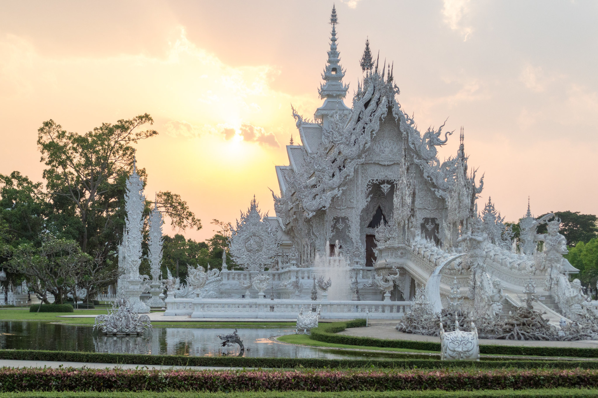 Poi, partite a scoprire i meravigliosi templi Wat Rong Suea Ten, noto anche come il Tempio Blu, e Wat Rong Khun, conosciuto anche come il Tempio Bianco: visite imperdibili nel nord della Thailandia. Le spighe frastagliate di questo scintillante tempio emergono da un giardino erboso come un fuoco bianco e l'intera struttura si riflette elegantemente nel laghetto adiacente. Questa magnifica e intricata opera d'arte è una combinazione di arte antica e architettura contemporanea unica, realizzata dall‘artista locale Chalermchai Kositpipat.