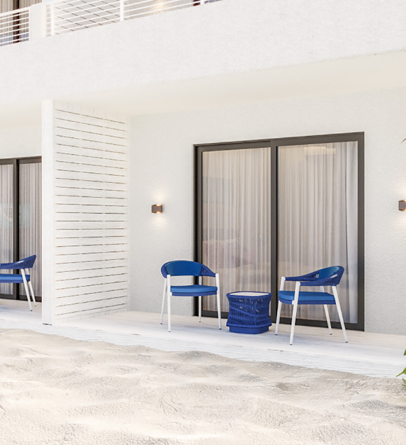 Le 2 Beach Pool Villas presentano la stessa superficie di 45m2 e gli stesse arredi delle due tipologie precendenti, una sul lato occidentale e l’altra all’estremità sud-est. Sono dotate di una piccola piscina e di una superificie prendisole. Entrambe sono vicine alla spiaggia.